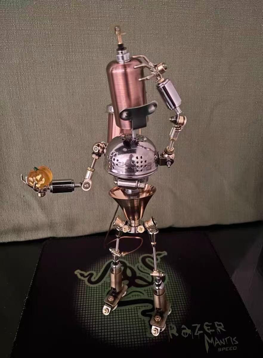 Exposed gears and metal plates create a strong steampunk aesthetic for display.