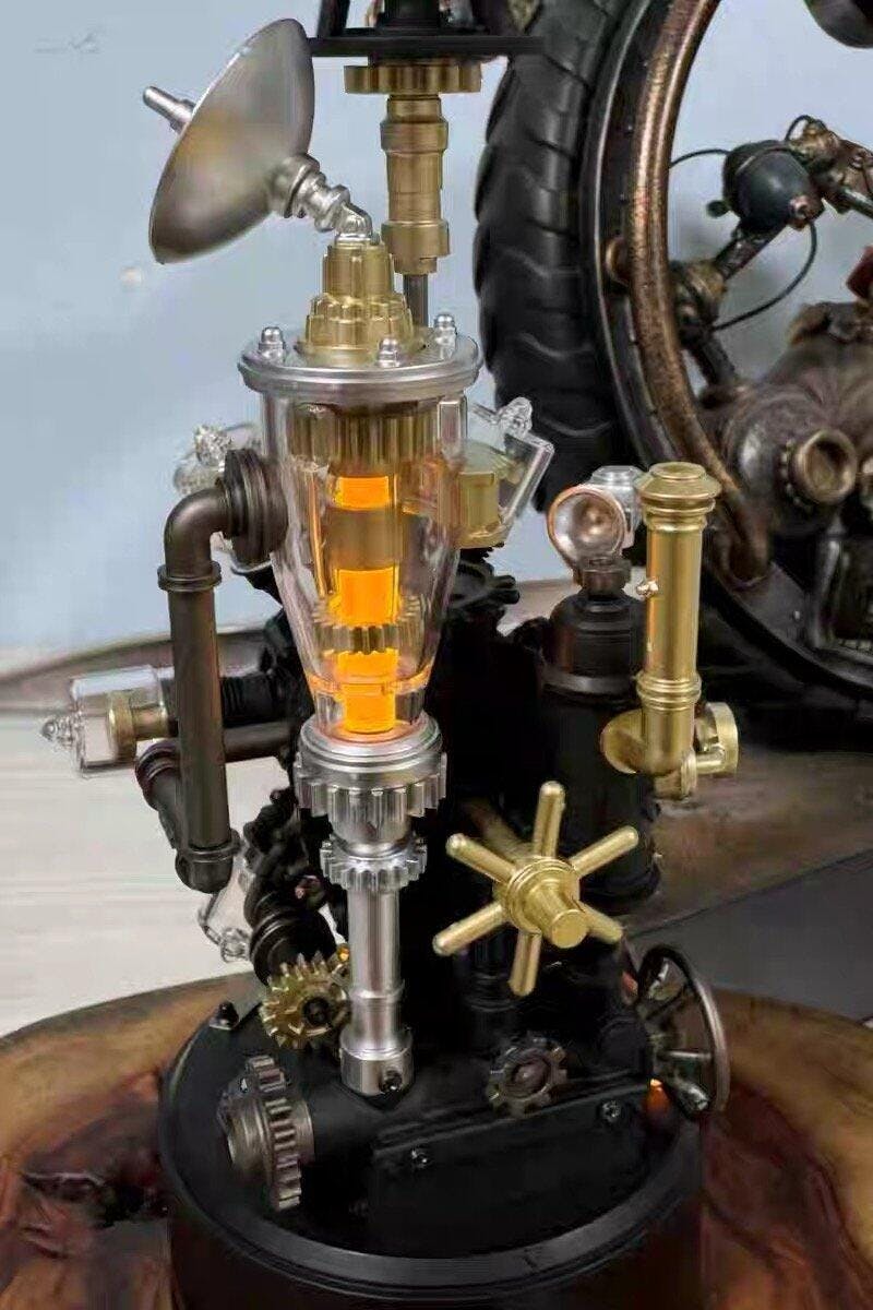 Metal materials, industrial supports and bolt details create a strong “steampunk × flight” aesthetic, perfect for desk display or photography.