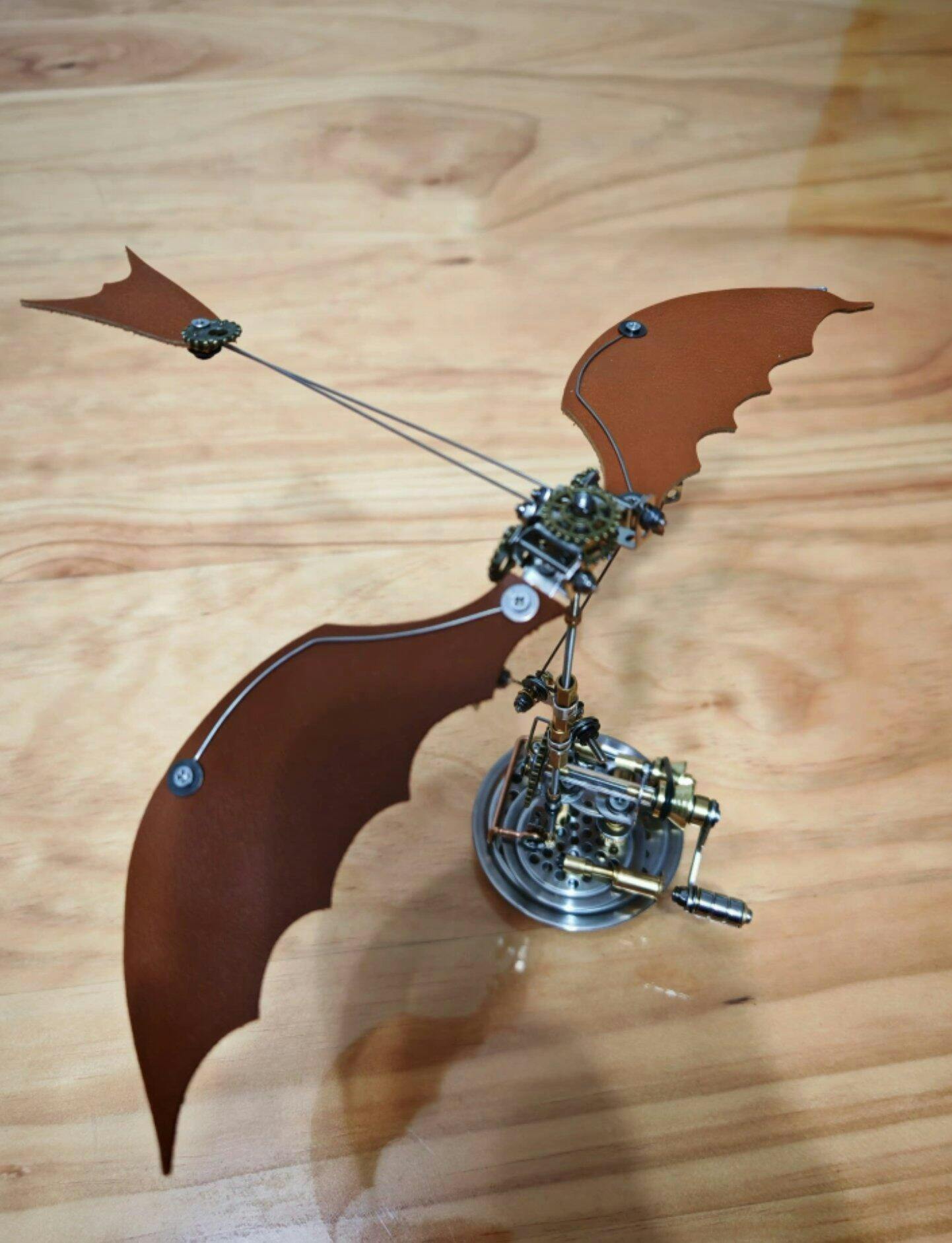 After assembly, the wings can flap or oscillate, with gear linkages giving motion—turning the desk model into a poised flying machine.